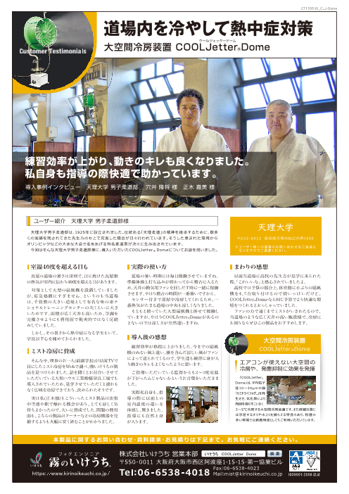 「COOLJetter(R) Dome」は、平均粒子径20~30μmの霧「セミドライフォグ(R)」を発生させ、気化熱により周囲を濡らすことなく2~4℃冷房する大空間冷房装置です。 また微細な霧には浮遊するチリやホコリを捕らえる特長もあり、粉塵の多い現場...