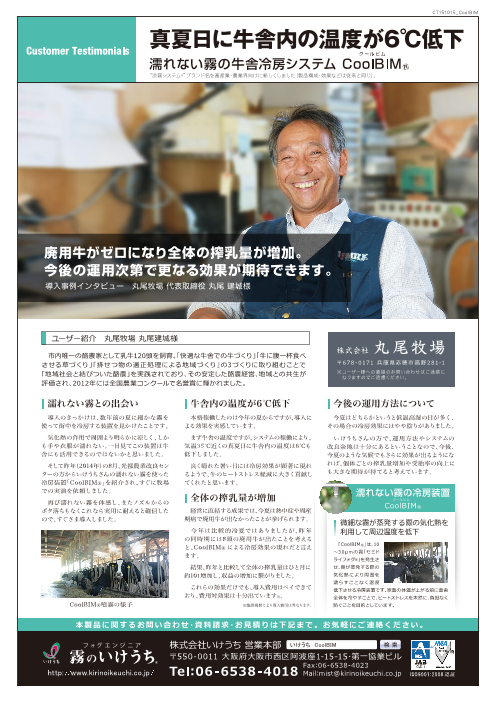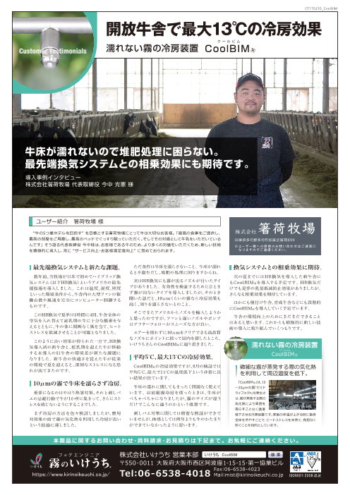 「CoolBIM(R)」は、10~30μmの霧「セミドライフォグ(R)」を発生させ、霧が蒸発する際の気化熱により周囲を濡らすことなく温度を低下させる冷房装置です。 家畜の体温が上がる前に畜舎全体を冷やすことで、ヒートストレスを未然に、負担なく防ぐことを...