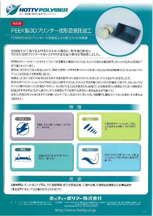 PEEK(ポリエーテルエーテルケトン)での三次元製品の製作においては、大ロットの場合は射出成型、小ロットの場合は切削加工が主流となっています。 弊社はPEEKの三次元製品において、弊社で製造したPEEK製フィラメントを用いたFDM(熱溶解積層方式)方式...
