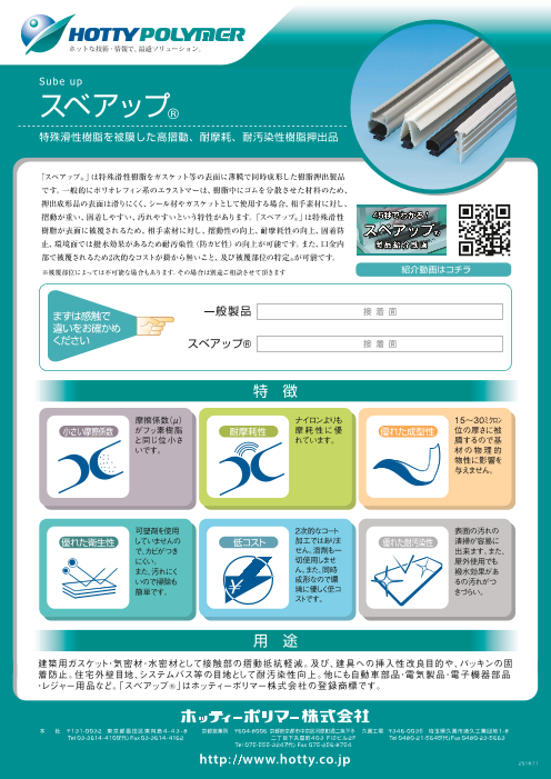 「スベアップ」は特殊滑性樹脂をガスケット等の表面に薄膜で同時成形した樹脂押出製品です。 一般的にポリオレフィン系のエラストマーは、樹脂中にゴムを分散させた材料のため、押出成形品の表面は滑りにくく、シール材やガスケットとして使用する場合、相手素材に対し、...