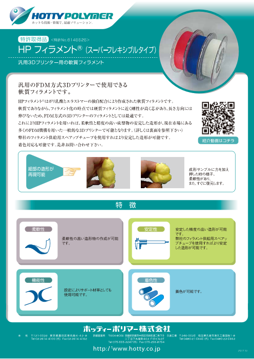 「HPフィラメント」は汎用のFDM方式3Dプリンターで使用できる軟質フィラメントです。 ・柔軟性の高い造形物の作成が可能です。 ・安定した精度の高い造形が可能です。 ・設定によりサポート材等としても使用可能です。 ・着色が可能です。
