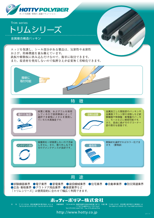 『トリムシリーズ』は、エッジを保護し、シール部分がある製品は、気密性や水密性および防塵機能を兼ね備えた金属複合構造パッキンです。 鉄板や樹脂板に挟み込むだけなので、簡単に取付できます。 接着剤を使用しないので仮押さえが必要無く省略化できます。 ...