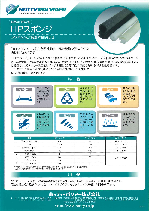 『HPスポンジ』は、樹脂を当社独自の配合技術で発泡させた画期的な商品です。 一般環境下において優れた圧縮永久歪みを有します。また、元来低比重であるエラストマーを更に軽量化させる事が出来るため、商品の軽量化が可能であり、体積抵抗が低いため、電気絶縁用...