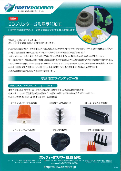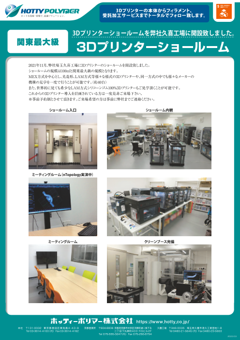 2021年11月、ホッティーポリマーの埼玉久喜工場に3Dプリンターのショールームを開設致しました。 MEX方式を中心とし、光造形、LAM(液体積層)方式等様々な様式の3Dプリンターや、同一方式の中でも様々なメーカーの機種の見学を一度で行うことが可能...