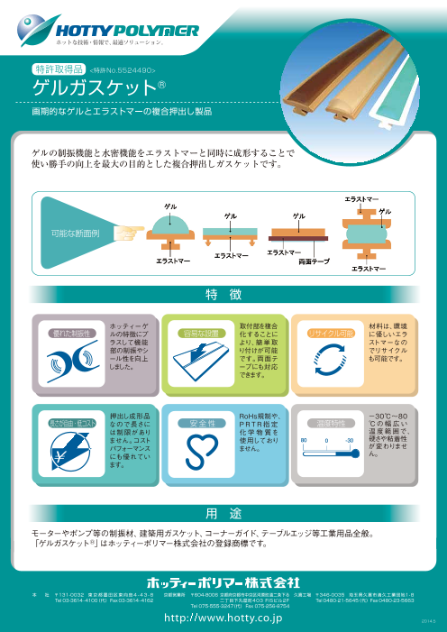 『ゲルガスケット』は、ゲルの制振機能と水密機能をエラストマーと同時に成形したシール材です。 使い勝手の向上を最大の目的としており、押出し成形品なので長さには制限がありません。 材料は環境に優しいエラストマーなのでリサイクル可能で、化学物質を使...