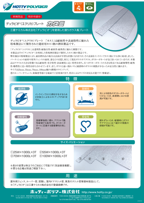 「デュラビオ®(エクリカ®)」は透明性・耐傷付性・耐熱性に優れた樹脂です。 本製品はその「デュラビオ®」を利用した特殊押出製法で製作したカスミ柄の製品です。 弊社独自の特殊製法により、通常押出し品の場合は表面が平滑な状態になりますが、その表面をインラ...