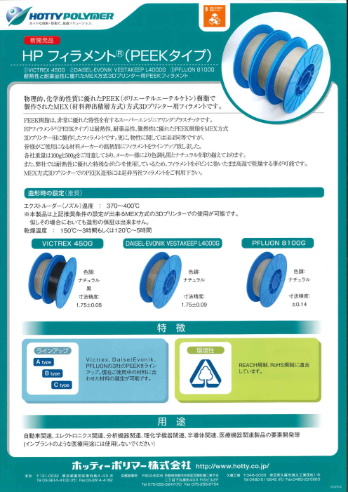 『HPフィラメント(PEEKタイプ)』は、物理的、化学的性質に優れたPEEK樹脂で製作されたFDM(熱溶解積層方式)方式3Dプリンター用フィラメントです。 更に物性に関してはほぼ同等ですが、皆様がご使用になる材料メーカーの銘柄別にフィラメントをライ...