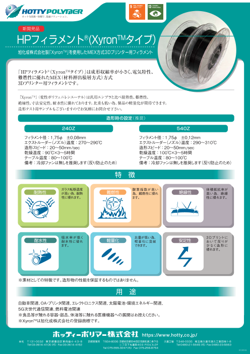 「HPフィラメント(Xyron™タイプ)」は成形収縮率が小さく、電気特性、難燃性に優れたMEX(材料押出積層方式)方式3Dプリンター用フィラメントです。 「Xyron™」(変性ポリフェニレンエテール)は汎用エンプラと比べ耐熱性、難燃性、絶縁性、寸法安定...