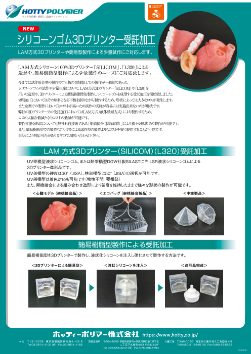 今までは試作用金型の製作やゴム板の切削加工での製作が一般的であったシリコーンゴムの試作や少量生産において、LAM方式3Dプリ「SILICOM」や「L320」を用いた造形や、3Dプリンターによる簡易樹脂型を製作しシリコーンゴムを成形する受託加工を開始いたし...