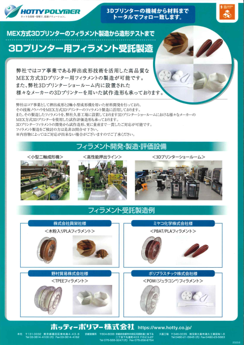 押出成形技術を活用した高品質なMEX(FDM)方式3Dプリンター用フィラメントの製造が可能です。 また、弊社3Dプリンターショールーム内に設置された様々なメーカーの3Dプリンターを用いた試作造形も承っております。 フィラメント製造をご検討の方はぜ...