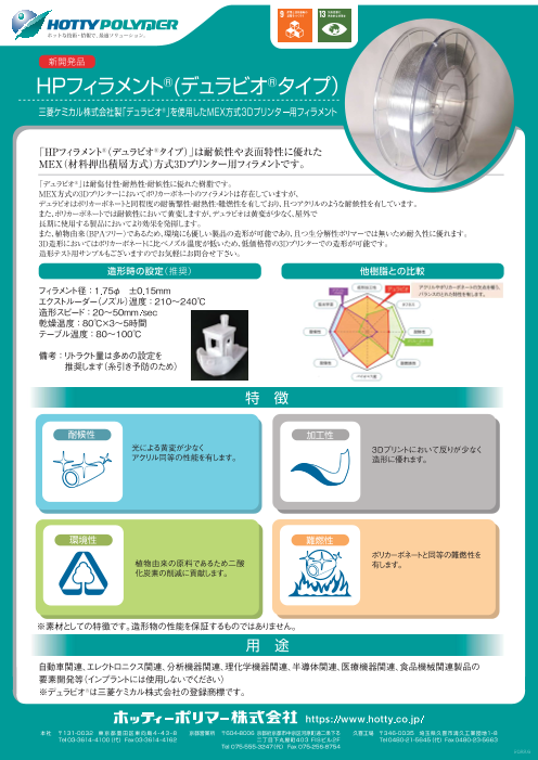 「HPフィラメント®(デュラビオ®タイプ)」は耐候性や表面特性に優れたMEX(材料押出積層方式)方式3Dプリンター用フィラメントです。 「デュラビオ®」は耐傷付性・耐熱性・耐候性に優れた樹脂です。 MEX方式の3Dプリンターにおいてポリカーボネートの...
