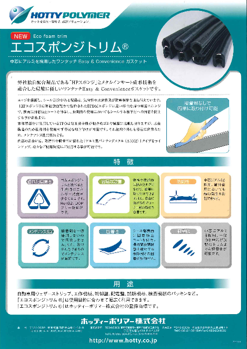 エッジを保護し、シール部分がある製品は、気密性や水密性および防塵機能を備えています。 「HPスポンジ」は弊社独自配合で製作されたEPDMスポンジに近い特性を持つ樹脂スポンジで、表面に固着防止コートを付与し、長時間の使用においてもシールする相手材への固着...