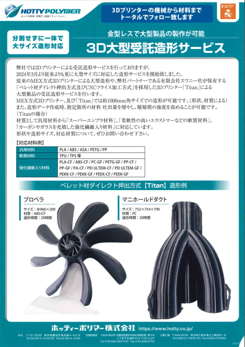 ホッティーポリマーでは、従来のMEX方式3Dプリンタによる大型造形や、同社のパートナーであるスワニー社が保有する「ペレット材ダイレクト押出方式およびCNCフライス加工方式」を採用した3Dプリンター「Titan」による大型製品の受託造形サービスを提供してお...