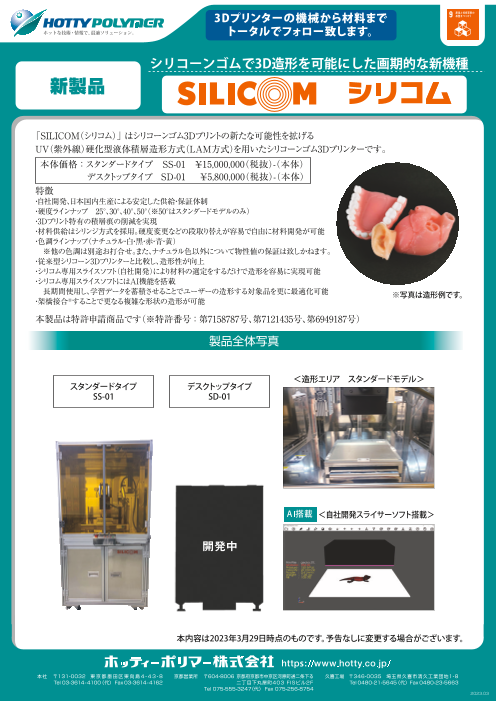 「SILICOM(シリコム)」はシリコーンゴム3Dプリントの新たな可能性を拡げるUV(紫外線)硬化型液体積層造形方式(LAM方式)を用いたシリコーンゴム3Dプリンターです。 ■特徴 ▼日本国内生産による安定した供給・保証体制 ▼低硬度から高硬度...
