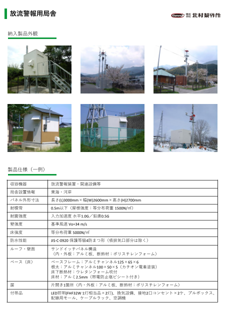ダム放流情報を住民へ知らせるための警報装置や電源装置、サイレン制御盤などを収容する放流警報用局舎です。 機器の安定稼働には、機器収納局舎内の温度・湿度のブレをなくし適正に保つことが重要です。当社の局舎は、 アルミニウム板で高断熱ボードをサンドイッチし...