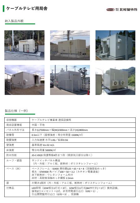 高強度でありながら、軽量化と高気密・高断熱性能を両立。 任意地点への可搬、設置が容易なコンテナタイプの機器収容箱です。 e:economy・ecology K:軽量・高断熱・Kitamura S:サンドイッチ型 P:パネル ◆詳細はカ...