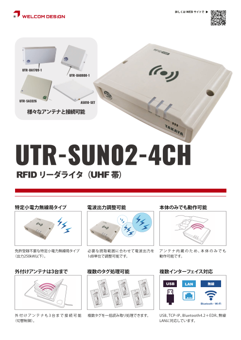 特定小電力無線局タイプのRFIDリーダライタ(UHF帯)。 アンテナ内蔵の他、外付けアンテナも3台まで接続可能(切替制御)