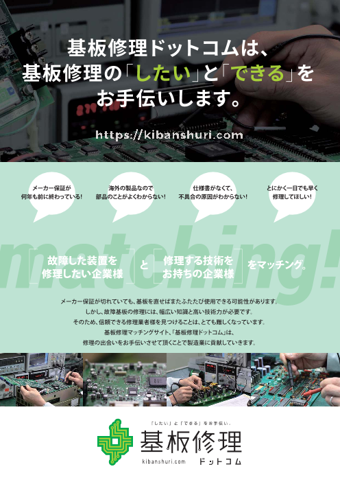 「基板を修理してほしい人(=依頼者)」と「基板修理の案件を探している人(=修理者)」とを結び付ける、マッチングプラットフォームです。 【詳細】カタログをダウンロードしてご覧ください。 【URL】https://kibanshuri.com/
