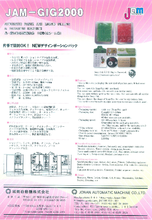 ・今までに無いポーションタイプの包装を実現。 ・片手で開封できる新しいタイプの包装形態。 ・旅行など携帯に便利な使い切り容器。 ・手を汚さず、容器に充填物が残らない。 ・打抜き形態の選択が可能。 ・機械連数を増やすことで能力倍増が可能。 ...
