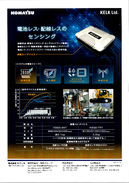 設備保全・環境モニタリング、センサネットワーク電源に 最適なセンサ・無線発信器一体型の無線センサデバイス 電池レス・メンテナンスフリーで半永久的に使用可能。 ◆詳細はカタログをダウンロードしてご覧ください。