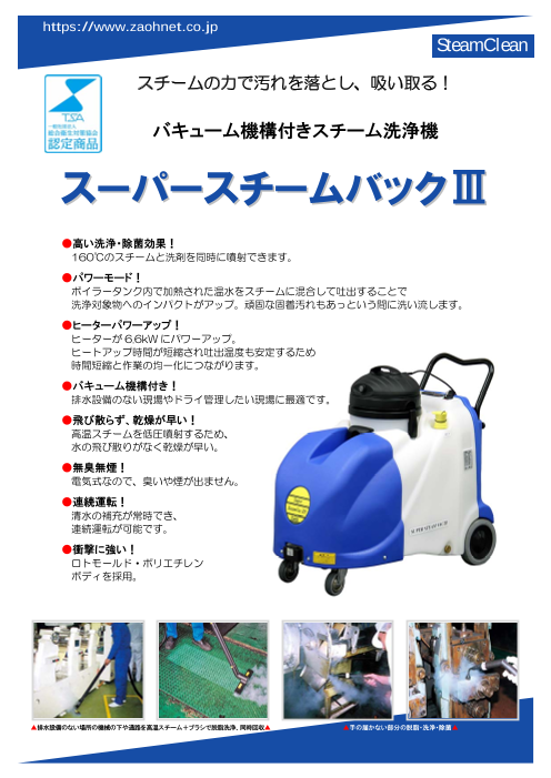 3相200Vを使用した本格的な業務用スチーム洗浄機。脱脂作業や飛散の無い洗浄が可能です。バキューム機能付なので排水設備の無い現場や、ドライ管理の現場に最適です。