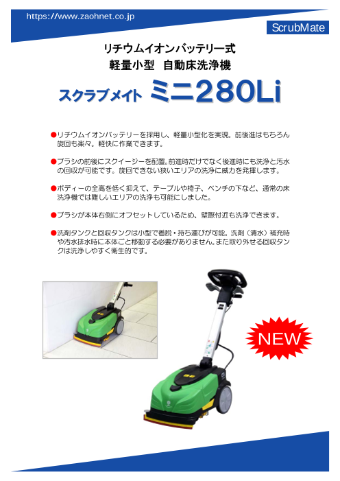 洗浄+回収が可能な床洗浄機の最新モデルです。リチオムイオンバッテリー搭載でより一層小型になりました。前進だけでは無く、後進時も汚水の回収が可能で、あらゆる現場に対応可能です。