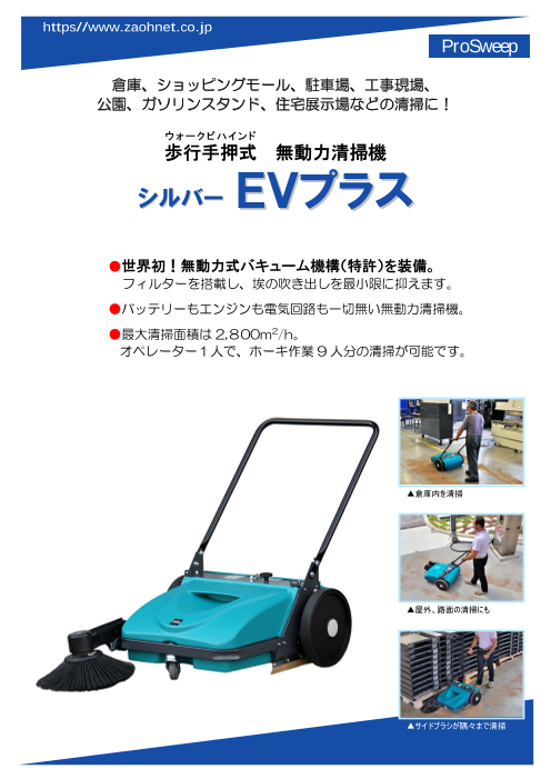 ◆倉庫、ショッピングモール、駐車場、工事現場、公園、ガソリンスタンド、住宅展示場などの清掃に! ◆フィルターを搭載し、埃の吹き出しを最小限に抑えます。 ◆バッテリーもエンジンも電気回路も一切無い無動力清掃機。 ◆最大清掃面積は 2,800m2/h...