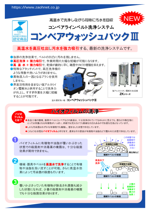 高温水を高圧吐出し汚水を強力吸引する、最新の洗浄システムです。 ◆抜群の洗浄効果で、ベルトの凹凸に汚れを残しません。 ◆高圧洗浄+強力吸引で、作業時間の大幅な短縮が可能になります。 ◆高温水+強力吸引で、乾燥が劇的に早く、雑菌やカビの増殖を抑...