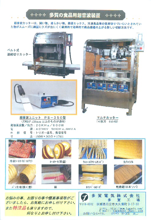 超音波カッターの効果とは・・・ 刃物に超音波振動を加えることで刃物が高速で伸縮をくり返す事で常に刃物が微少に動いている事になります。カットする時に刃物と食品の間に界面(接触面)に隙間が生じた様になり滑り性が良くなり切れ易くなります。又、クリーム等も付着...