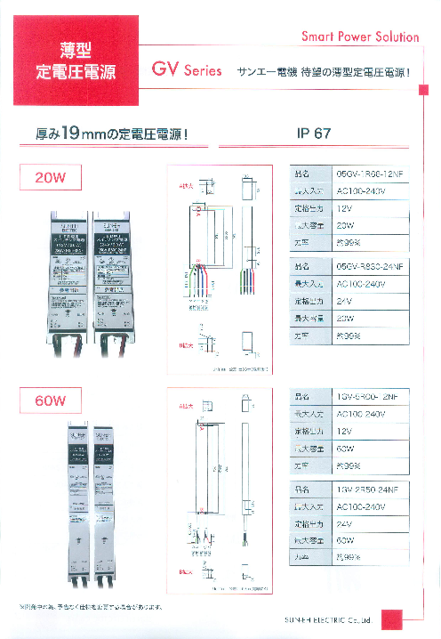 ・厚み19mmの定電圧電源! ・20W 05GV-1R66-12NF、05GV-R830-24NF ・60W 1GV-5R00-12NF、1GV-2R50-24NF ・100W 2GV-8R30-12NF、2GV-4R16-24NF ・150W ...
