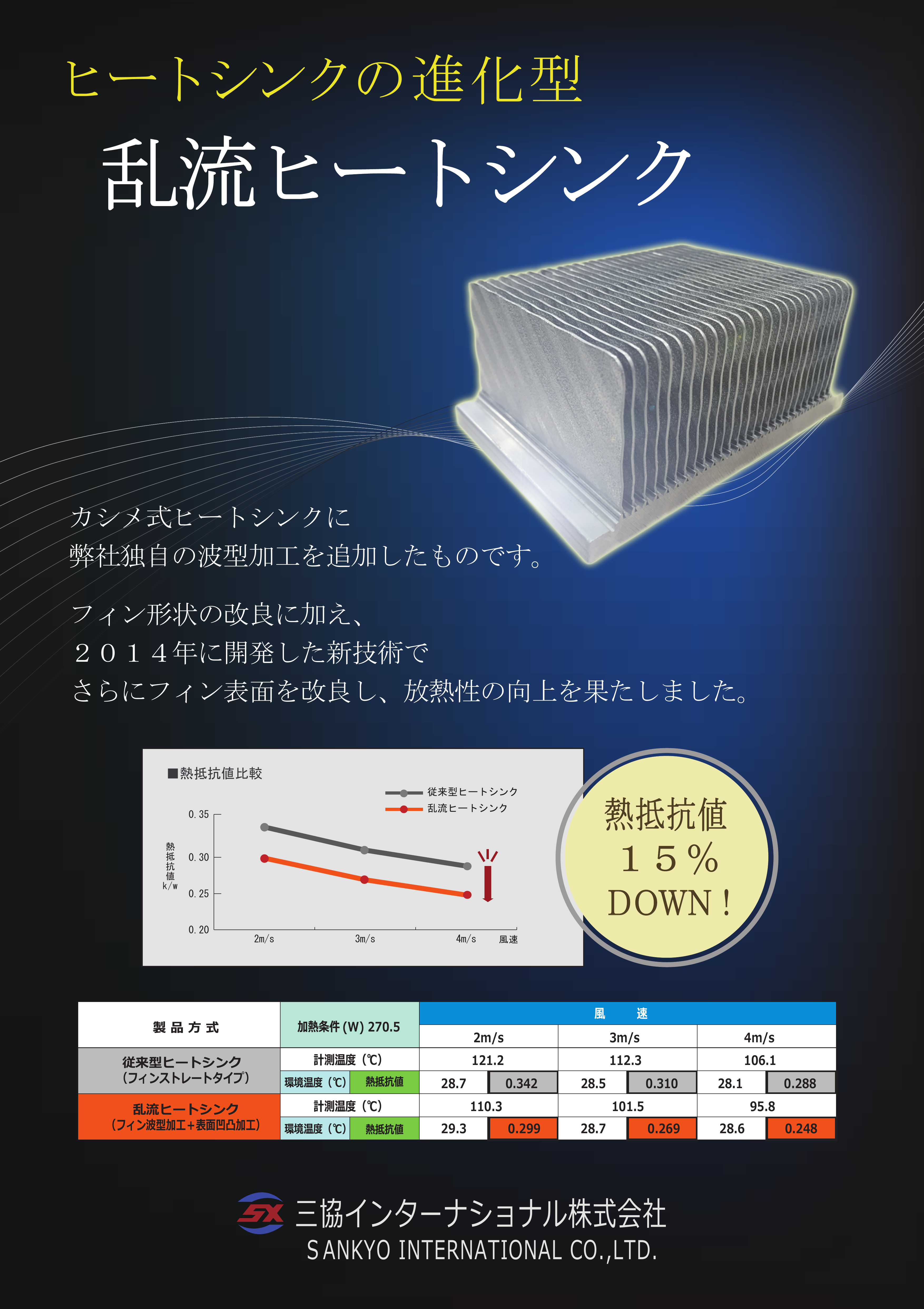 フィン形状の改良に加え、2014年に開発した新技術でさらにフィン表面を改良し、 放熱性の向上を果たしました。カシメ式ヒートシンクに弊社独自の波型加工を追加したものです。