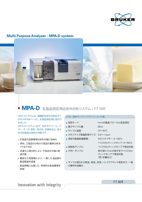 M P A - D シ ス テ ム 1 台 で 、生 乳 や ク リ ー ム 、バター、チーズ、粉乳、加工乳、乳飲料など、あらゆる乳製品の測定が可能です。 ◆詳細は、カタログをダウンロードしてご覧ください。