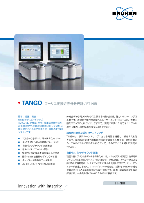 TANGOは、高精度、堅牢、簡単な操作性など、品質管理や生産管理の現場において分析装置に求められる全てを満たす、最新のFT-NIRシステムです。 ◆ブルカーならではのFT-NIRテクノロジー ◆タッチスクリーンによる簡単オペレーション...