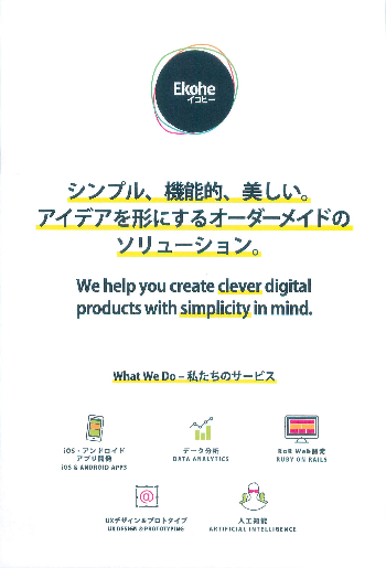私たちのサービス iOS・アンドロイドアプリ開発、データ分析、RoR Web開発、UXデザイン&プロトタイプ、人工知能 業界実績 音楽・エンターテインメント、金融・ベンチャーキャピタル、家族・教育、ヘルスケア、フィットネス・ウェルビーイング、N...