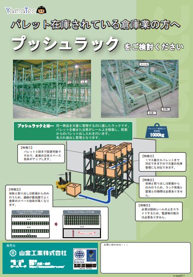 ◆プッシュラックとは... 同一商品を大量に管理するのに適したラックです。 パレットを載せた台車がレール上を移動し、前面からのパレット出し入れを行います。先入れ後出し管理となります。 ◆パレット3段まで設置可能ですので、倉庫の立体...