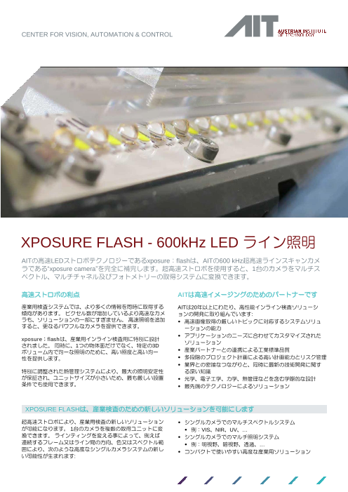 オーストリアAITが提供する超高速LEDストロボ ライン照明xposure Flashは産業用インライン検査用に特別に設計されました。同時に、1つの物体面だけでなく、特定の3Dボリューム内で均一な照明のために、高い照度と高い均一性を提供します。20年以上...