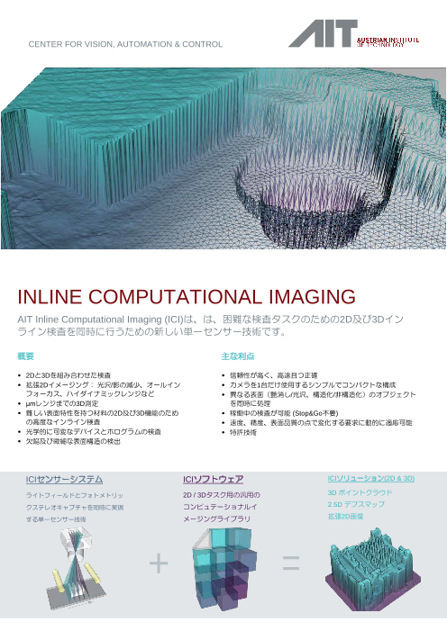 オーストリアAITが提供するInline Computational Imaging(ICI)は、2Dと3Dのインライン検査を同時に実行できる新しい単一センサー技術です。ライトフィールドイメージングとフォトメトリックステレオの利点を1つのコンパクトなソリ...