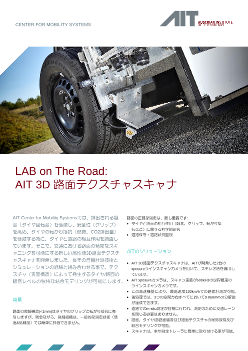 オーストリアAITが提供する600kHzの世界最速級マルチラインスキャンCMOSカメラxposure Cameraを2台用いたステレオ法により3D路面テクスチャスキャナは、従来困難でった時速100km以上の高速測定を可能にした路面計測の新しい提案です。 ...