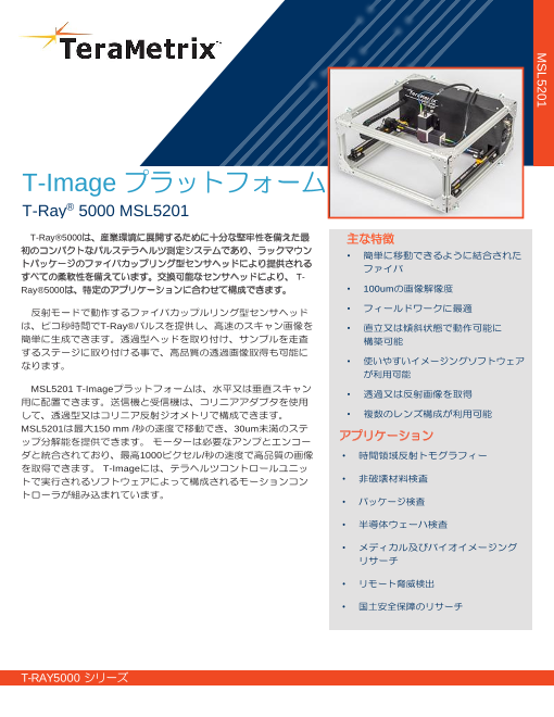 TeraMetrix社(テラメトリクス社)が提供するT-Image プラットフォーム、テラヘルツ測定システムT-Ray®5000が搭載可能で、交換可能なセンサヘッドにより特定のアプリケーションに合わせて構成できます。最大150 mm /秒の速度で移動且つ...