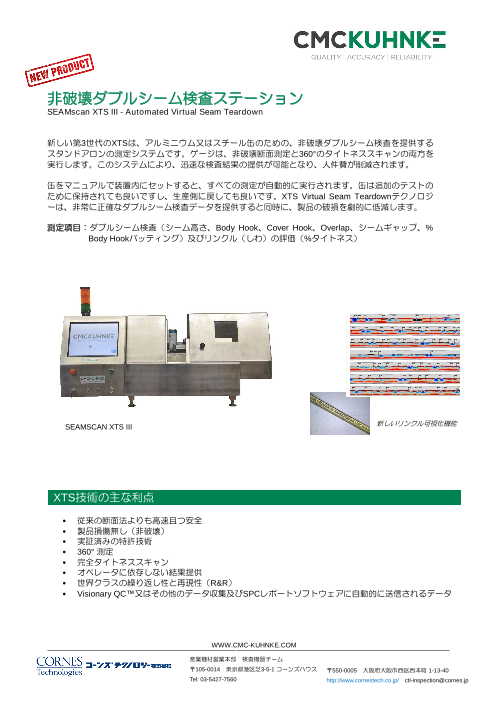 CMC-KUHNKE(CMC-クンケ)社が提供するSEAMSCAN XTS IIIは、従来のX線技法での課題であった分解能の面で大幅な改善が図られた高分解能・高速X線非破壊巻締検査装置です。 ダブルシーム検査(シーム高さ、Body Hook、Cover...