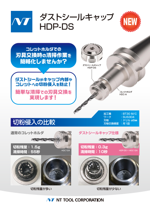 コレットホルダでの刃具交換時の清掃作業を簡略化しませんか? ダストシールがキャップ内部やコレットへの切粉侵入を防止! 簡単な清掃での刃具交換を実現します! エヌティーツールのコレットホルダ(HDC・Aシリーズ、HDZシリーズ)に対応します。