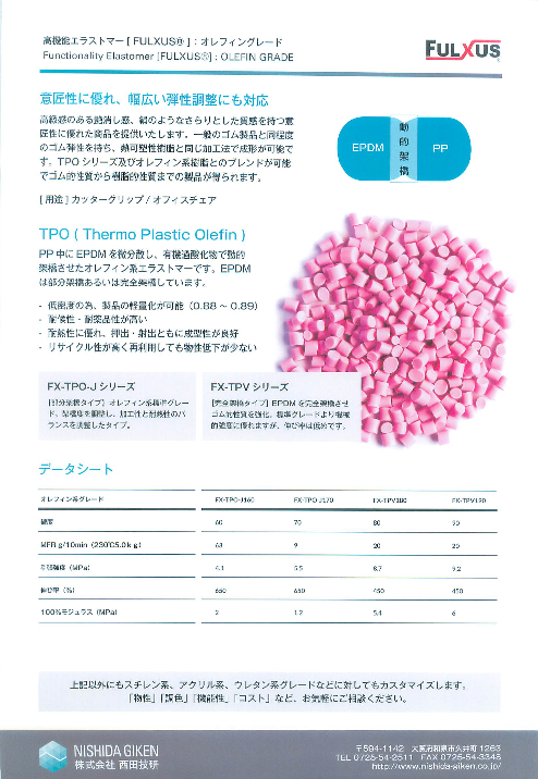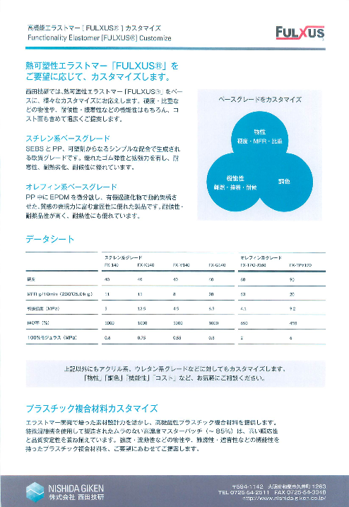 西田技研では、熱可塑性エラストマー「FULXUS」をベースに、 様々なカスタマイズにお応えします。 硬度・比重などの物性や、耐候性・接着性などの機能性はもちろん、 コスト面も含めて幅広くご提案します。 ◆詳細はカタログをダウンロードしてご覧く...