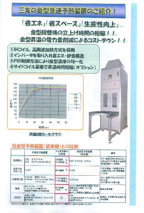 ・金型昇温の電力量削減によるコストダウン!! ・IHコイル、高周波加熱方式を採用 ・インバータを取り入れ省エネ・静音構造 ・PID制御方法により金型温度の均一化 ◆詳細はカタログをダウンロードしてご覧下さい。