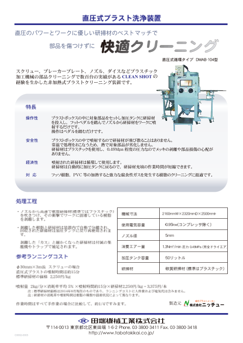 ・TABATAはユーザーの皆様の声を大切に育てる機械づくりを目指しています。 ・ふっ素樹脂(PTFE)成型装置 ・小型射出成形機 ・小型排ガス処理装置 ・CLEAN SHOT(固着ポリマー除去装置) ・会社概要 ・沿革 ◆詳細はカタログ...