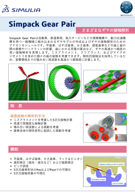 Simpack Gear Pairは、自動車や鉄道車両、風力タービンなどの大規模機構や動力伝達機構に組み込まれるギヤモデルの作成と接触解析を行うためのアドオンモジュールです。さまざまな種類のギヤに対応し、高速かつ精度の高い接触解析を実現します。ミスアライ...