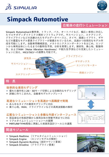 Simpack Automotiveは、幅広い車両に対応したマルチボディダイナミクス解析ソフトウェアで、洗練されたモデルデータベースと豊富なモデル要素ライブラリーが装備されています。自動車部品やメカトロニクスコンポーネントの動特性予測や分析を提供し、操安...