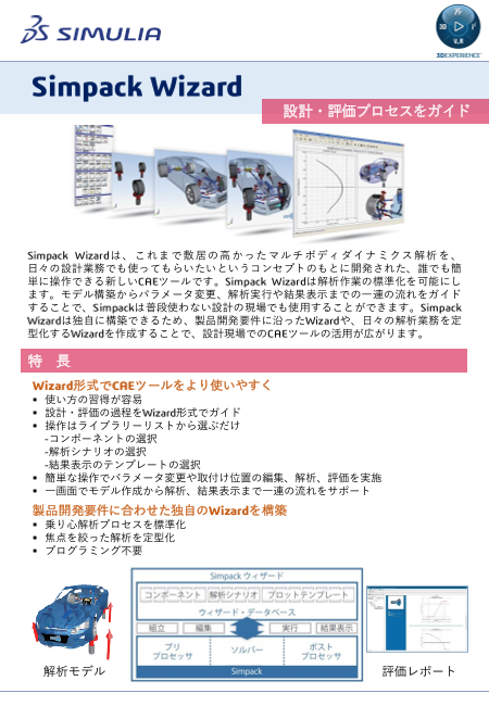 Simpack Wizardは、マルチボディダイナミクス解析を一般の設計業務にも普及させるために開発された新しいCAEツールです。解析作業の標準化を可能にし、モデル構築から結果表示までの流れを簡素化します。独自に構築できるため、製品開発要件や日々の解析業...
