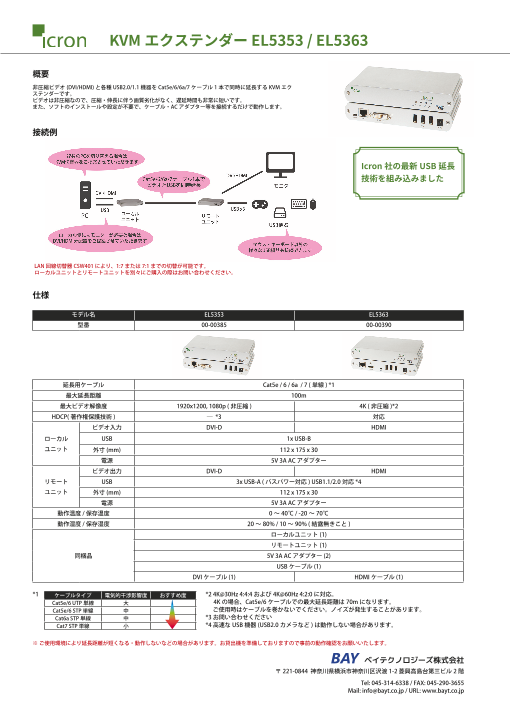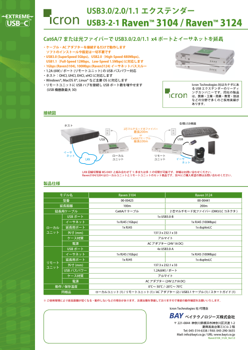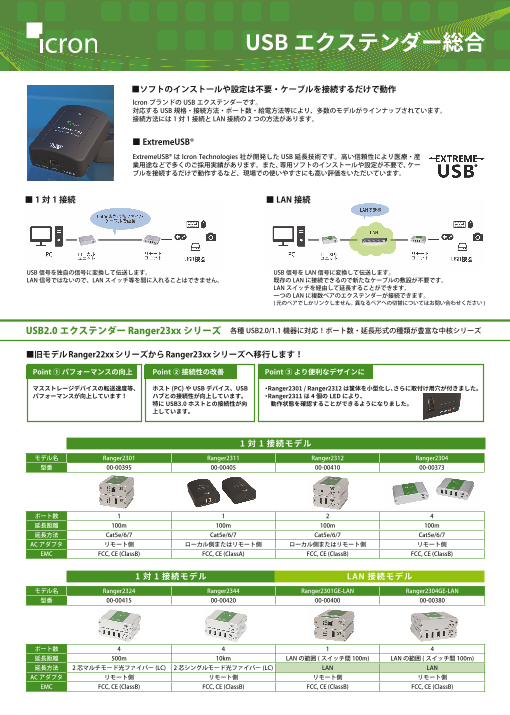 Icron ブランドの USB エクステンダーです。 対応する USB 規格・接続方法・ポート数・給電方法等により、多数のモデルがラインナップされています。 接続方法には 1 対 1 接続と LAN 接続の 2 つの方法があります。