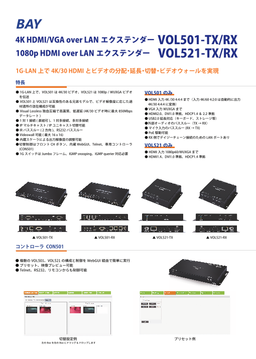 ●1G-LAN 上で、VOL501 は4K/30 ビデオ、VOL521 は1080p / WUXGA ビデオを伝送 ●VOL501 とVOL521 は互換性のある兄弟モデルで、ビデオ解像度に応じた適材適所の混在構成が可能 ●Visual Lossle...