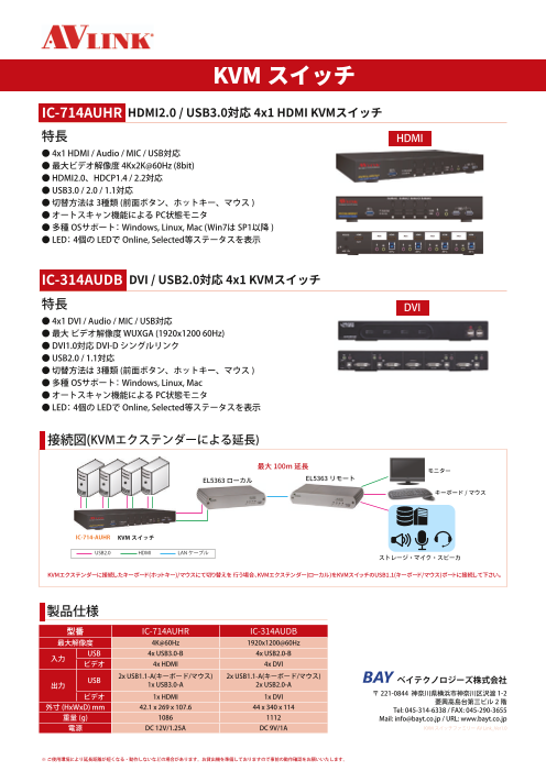 IC-714AUHR HDMI2.0&USB3.0 対応4x1 HDMI KVM スイッチ 特 長 ● 4x1 HDMI / Audio / MIC / USB 対応 ● 1 セットのキーボード、マウス、モニタで4 台のPC を操作 ● ビデオ...